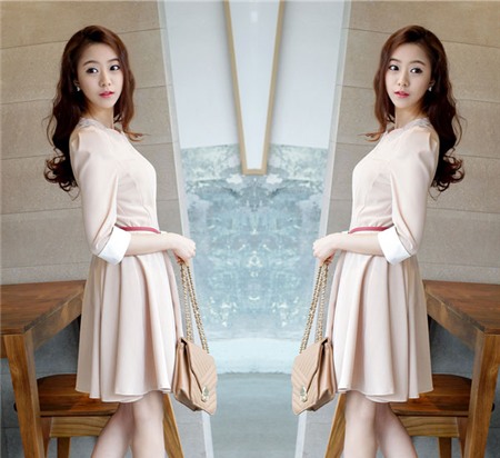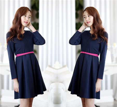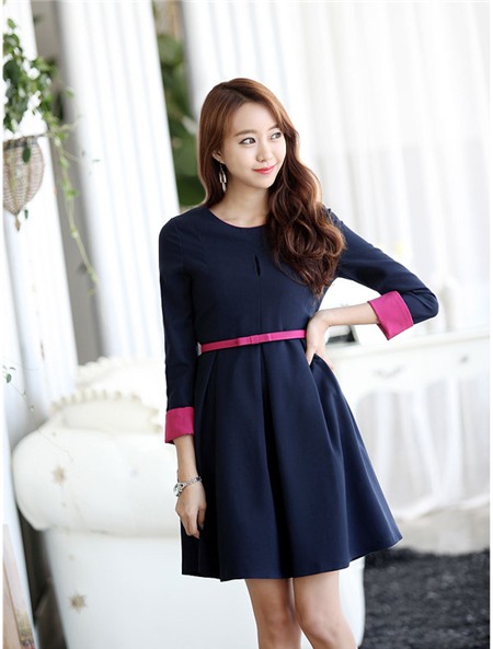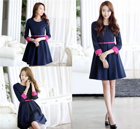 Pha trộn màu sắc đối lập ở phần tay áo và thắt lưng giúp dáng váy tối màu thêm nổi bật.